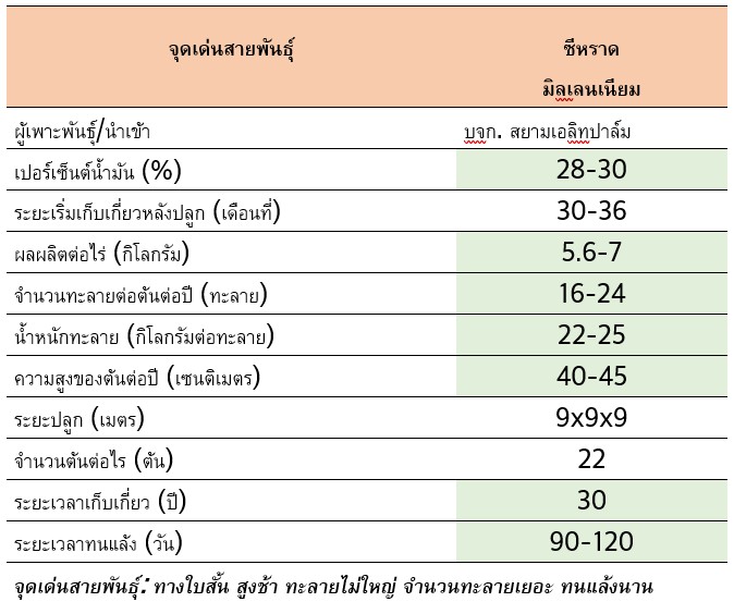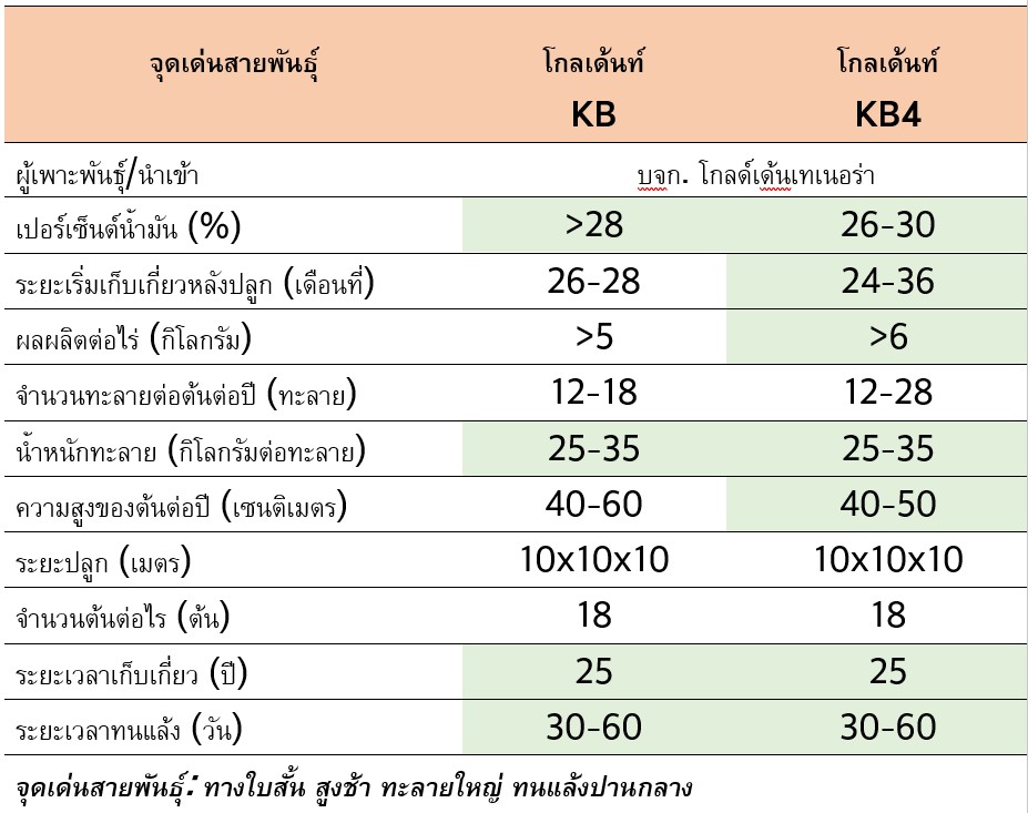 พันธ์ปาล์มที่บริษัทนำมาเพาะเพื่อจำหน่ายและแนะนำให้เกษตรกรปลูกมี 3 สายพันธุ์ ได้แก่ พันธุ์ซีหราด (CIRAD), โกลเด้นท์เทเนร่า เคบี (GOLDEN TENERA KB) และโกลเด้นท์เทเนร่า เคบี 4 (GOLDEN TENERA KB4)